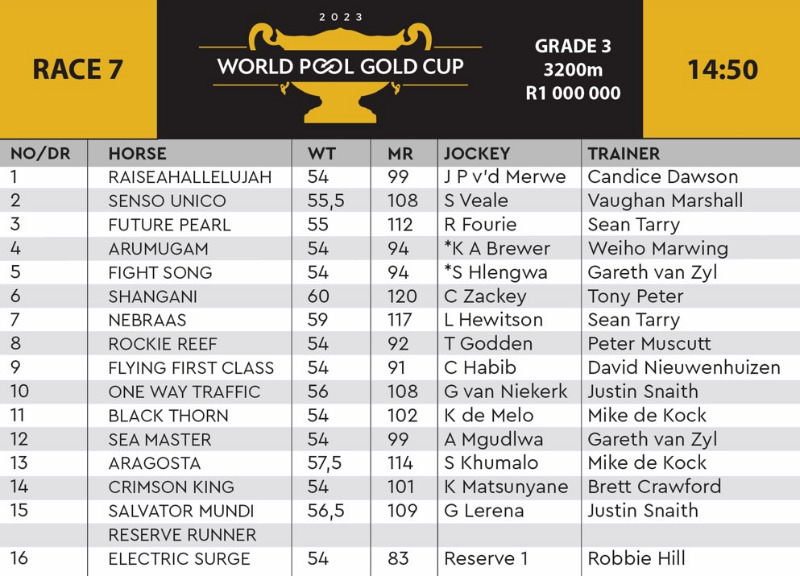 The Gr 3 World Pool Gold Cup has attracted a full field of 15 and among them is the Sean Tarry-trained three-year-old Futura gelding, Future Pearl, who will be attempting to emulate the 2017 feat of Hermoso Mundo by landing the unofficial stayers triple crown. He has won both the WSB Gold Bowl over 3200m and the DSTV Gold Vase over 3000m, so can make it a third "Gold" staying race next Sunday. The big bay relishes soft ground and is the current favourite. He will be ridden by Richard Fourie and is well drawn in three. Two former winners are in the line-up, Shangani and Nebraas, and they have drawn well in six and seven respectively. Hong Kong-based Lyle Hewitson rode Nebraas to victory two years ago and is reunited with him here. The big striding Senso Unico will want a good pace and if getting it can make an impact from draw two. Arumugam, owned by Durbanite Stephen Chetty, is trained by masterful trainer of stayers Weiho Marwing and has drawn four, but is considerably under sufferance at the weights. Fight Song and Sea Master represent Gold Cup-winning trainer of 2020, Gareth van Zyl, and have drawn five and 12. They are also under sufferance. Black Thorn made a cracking comeback in the Splashout 2200 and represents Mike de Kock. He has always struck as one with staying class, but this is his second run after a six month layoff. De Kock's former SA Derby winner Aragosta has drawn 13 but is capable of running on. Crimson King, the Gr 3 Splashout 2200 winner who was a close fourth in the Gr 3 Lonsdale Stirrup Cup over 2400m, will have a lot of supporters. However, he has drawn wide in 14. The Gr 2 New Turf Carriers Western Cape Stayers winner Salvator Mundi has drawn widest of all and has never excelled at Hollywoodbets Greyville. Stablemate One Way Traffic has disappointed since his outstanding win in last season's Vodacom 2200 race. Raiseahallelujah was a narrow second in the Lonsdale and has drawn in pole, but is under sufferance. Rockie Reef and Flying First Class are useful stayers, but are way under sufferance.