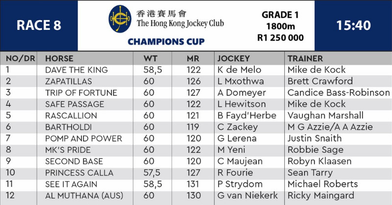 The Gr 1 HKJC Champions Cup over 1800m sees 14 in the line-up including See It Again, who will have a strong chance of being named Equus Champion Three-year-old male and Equus Horse Of The Year if he can win it from draw 13. Al Muthana is full of class and goes for a second WFA Gr 1 this season, but he has drawn widest of all. However, he is capable of a powerful finish from off the pace. Princess Calla has been exemplary over sprints this season, but stays this trip and has an electric turn of foot. The long-striding front-running sort Dave The King is ideally distance suited and will be a threat from draw one. Zapatillas will be running fresh which often favours horses in this race running against tired July runners. Trip Of Fortune ran on well in the July, but has had a long season. Safe Passage had no luck in the July, so this could be his race. Rascallion also deserves a change of luck and is distance suited. Bartholdi is a top sprinter and is interesting running fresh over this trip. Pomp And Power is full of class, but he is temperamental and is his own worst enemy. MK's Pride has class and should see out the trip. Second Base is doing very well for his new yard and is a dark horse.