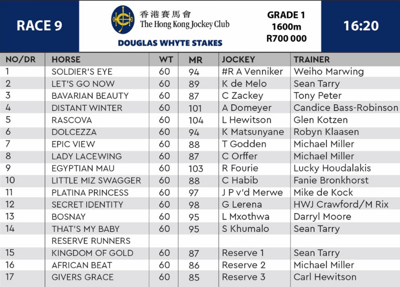 In the Gr 1 Douglas Whyte Stakes Platina Princess has eye catching form and will be improving being by Danon Platina, but she does have a tough draw. Secret Identity has shown class and should be running on strongly from a wide draw. Rascova finished second to the crack Mrs Geriatrix in the Gr 2 Zulu Kingdom Explorer Golden Slipper. Egyptian Mau was just behind her. Distant Winter was fourth in the latter race and also has a shout here. Let's Go Now is a full-sister to Bless My Stars and she still has plenty of scope for improvement. Dolcezza has some useful form and has a shout. That's My Baby is well regarded, but does have a tough draw.