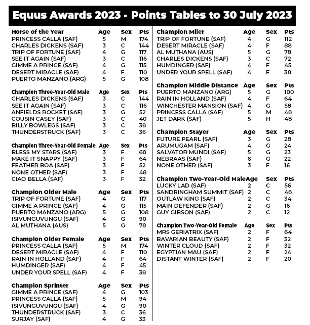 Princess Calla (174 points) won the final Super Grade 1 of the season on Sunday, the Grade 1 HKJC Champions Cup, to finish on top of the 2022/23 Equus Horse of The Year table. Charles Dickens was not active in the review period but easily held on to second place on the table with 144 points. x