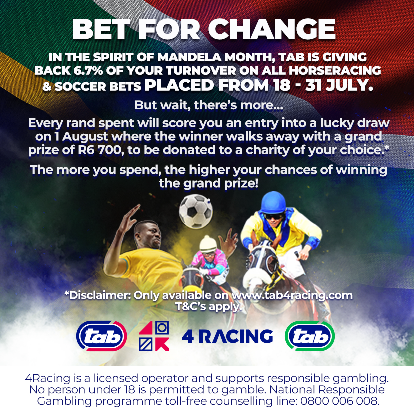 TAB is ratcheting up the excitement with a couple of special promotions for online customers. Take a TAB Win bet on Race 9 at the Gold Cup meeting and get your money back to a maximum of R5,000 if your horse runs second. Plus, there’s a Gold Cup Weekend Champion Punter competition with R10,000 in prizes for the top three punters from 28 to 30 July.