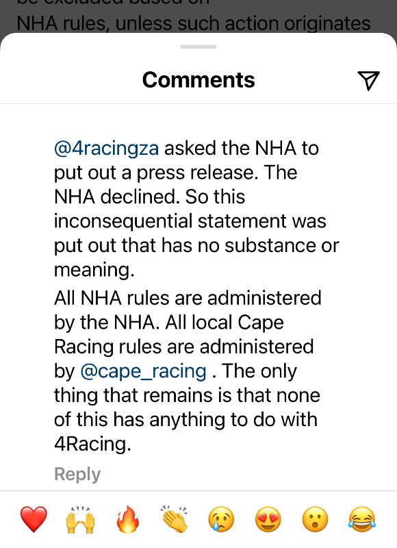 “4Racing remains wholeheartedly committed to the NHA” …”exemplified by our continued substantial support for the regulator while refraining from interfering with its processes”