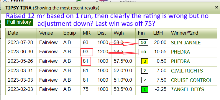 Most horses are adjusted within a few runs .... Tipsy to my mind is clearly racing off too high an MR,.... why am I wrong?