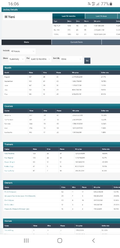 I chose Yeni because I knew he had a good association with Kelly Mitchley especially when the money is down. Also he had a quite a few winners for Oscar ( Mr Finlayson) if you also looking for jockey/owner combinations.