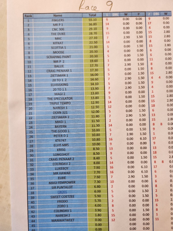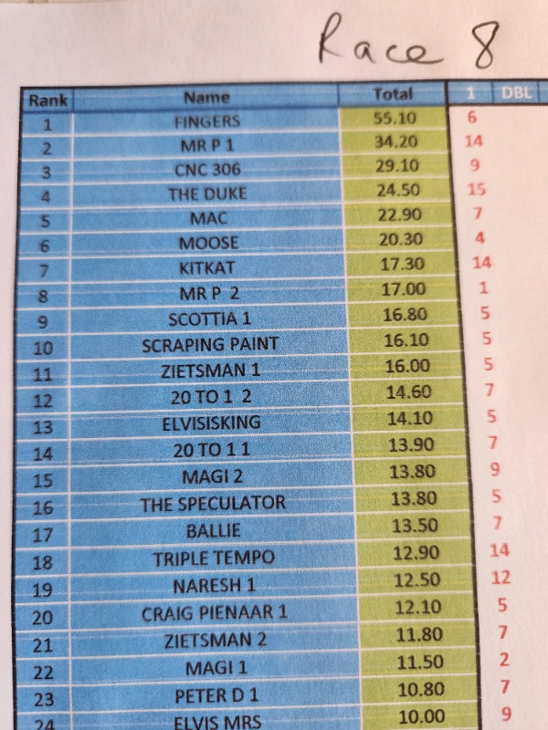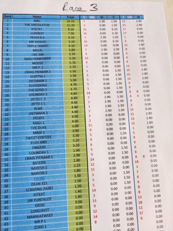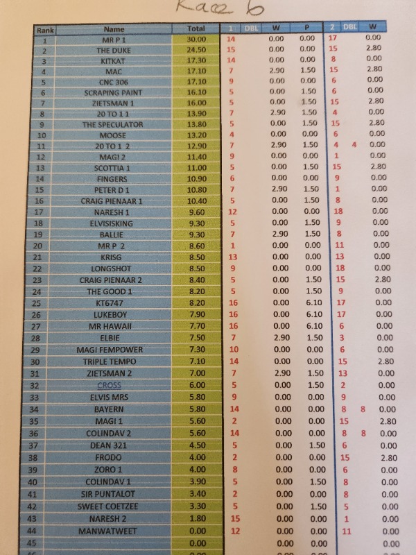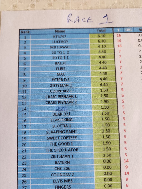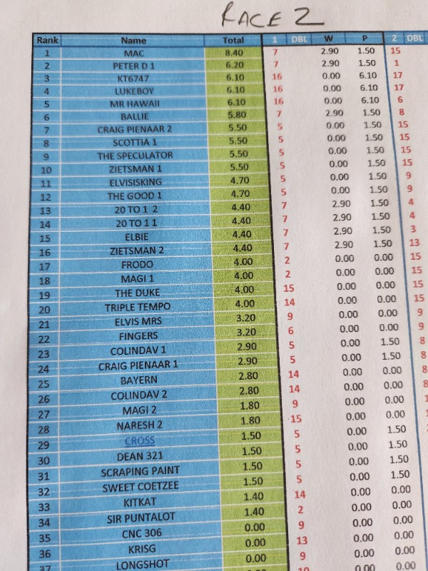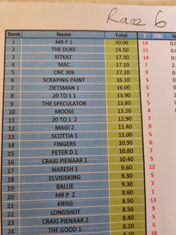 Guys the scratching of PETERS Runners has put a spoke in our computer...U may find your results slightly out......... just shout if u have been short changed.MAIN DEFENDER is a REFUND OF R 200.00