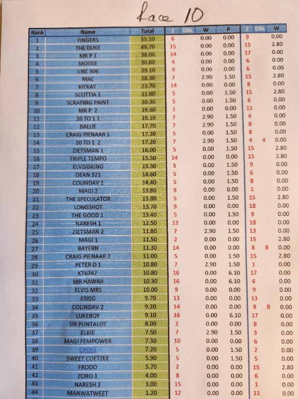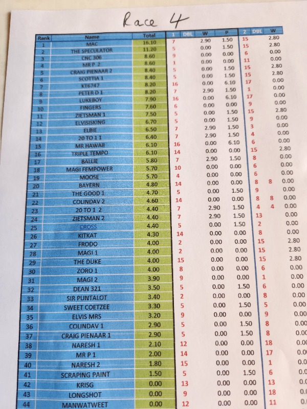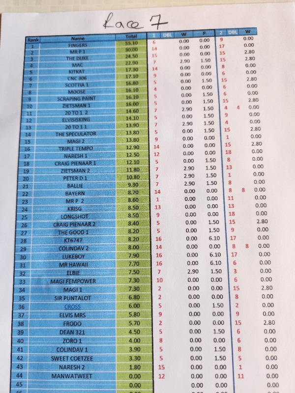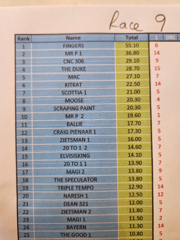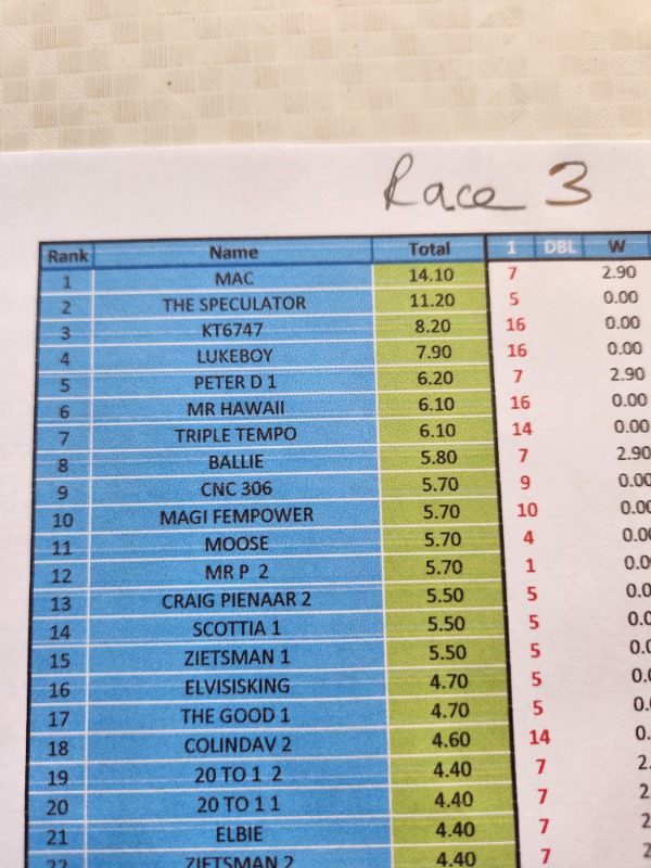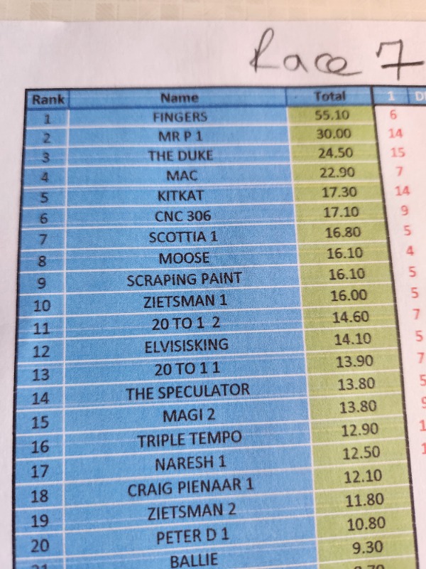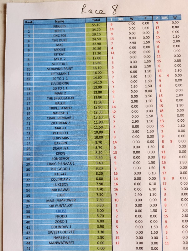 Guys the scratching of PETERS Runners has put a spoke in our computer...U may find your results slightly out......... just shout if u have been short changed.MAIN DEFENDER is a REFUND OF R 200.00