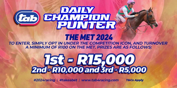 For TAB online customers the great news is that the prize money for this Saturday’s Daily Champion Punter competition on the Met meeting has been upped to R30,000. Opt into the competition on the website, bet at least R100 and you will be in the running for the R15,000 first prize with R10,000 for second and R5,000 for third. Tap on Competitions @ www.tab4racing.com for full details.