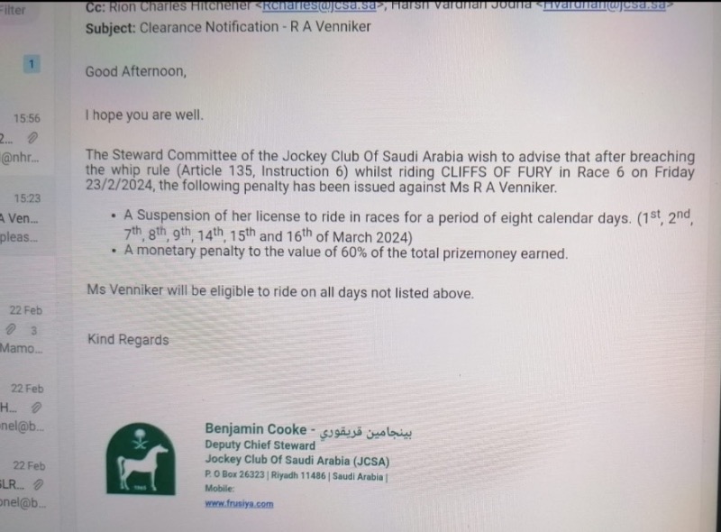 She sealed a $30,000 prize by ending the international challenge seven points clear of local champion Camillo Ospina, who was tied with Brazilian rider Victoria Mota but took the runner-up spot on account of his success in the opening mile handicap on Altawhidi.Last year's winner Luis Saez was also successful in the third leg on Pagan before Rachel Venniker flew down the home straight on Cliffs Of Fury to seal victory in the final race."It sends a message to aspiring jockeys to just keep trying," said Venniker, who is South Africa's only active female jockey. "It was a bit of a rough time for me until the last but if you have determination, keep going, you can be successful."