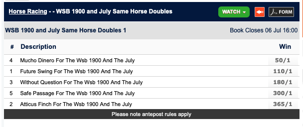 See World Sports Betting have priced up SHD for the WSB 1900 and the Hollywoodbets July