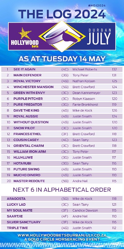 Hollywoodbets DURBAN JULY (Grade 1) Log as at 14 May 2024