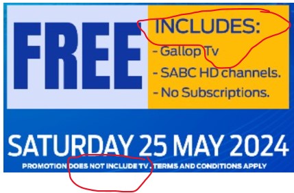 To the Main Defender bandits, this promo is disseminating mixed messages. You band me from Greyville by hitting me with a harsh sanction, then you request that I come to Greyville to collect the decoder, which might come with or without a TV, clarity required! Meet us half-way and deliver the TV and decoder so we can catch your world class local racing - until we kiss and make-up.