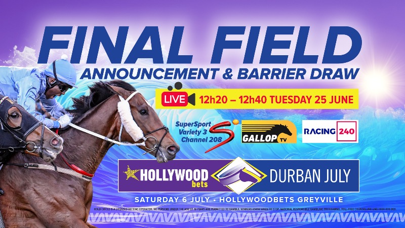HOLLYWOODBETS DURBAN JULY FINAL FIELD ANNOUNCEMENT & BARRIER DRAW TUESDAY 25 JUN