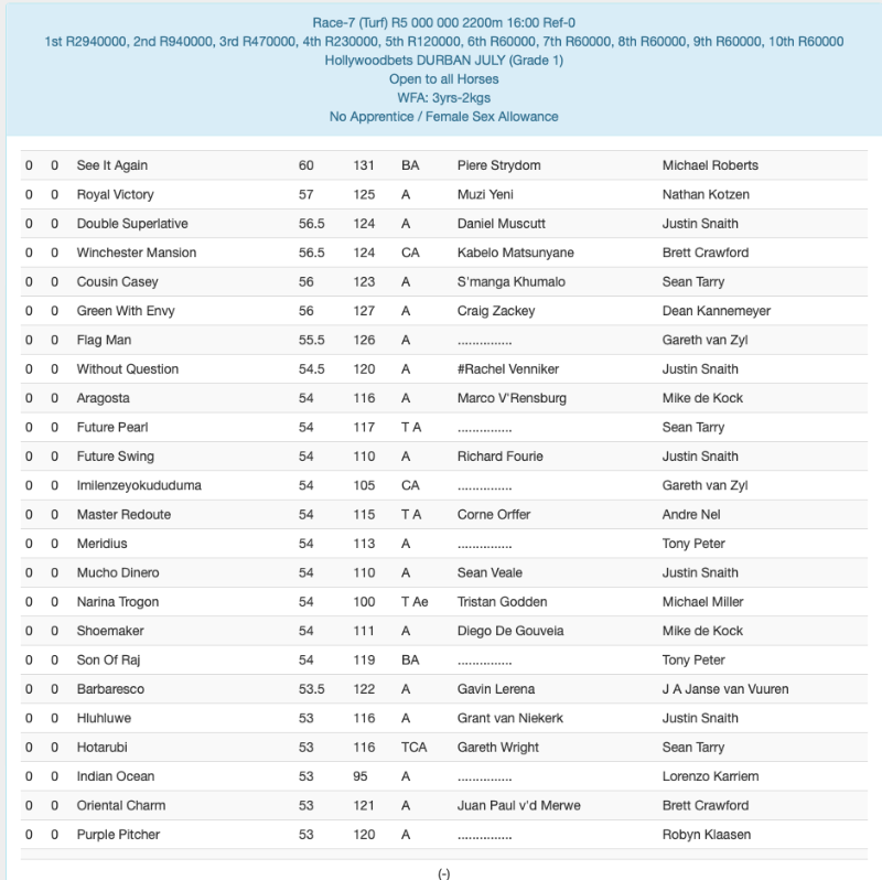 Re: HOLLYWOODBETS DURBAN JULY FINAL FIELD ANNOUNCEMENT & BARRIER DRAW TUESDAY 25 JUN