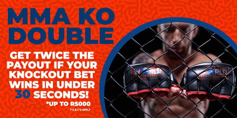 Get twice the payout on any MMA matchup/market if your winning bet ends with a knockout in under 30 seconds in the first round!*Pre-Match Bets only. Tâs & Câs apply. Refund/Payout limited to R5000.Free Bets do not qualify for this offer. Limited to 1 refund per customer per event.Promotion must be claimed within 24 hours of the fights finishing.Simply email promotions@wsb.co.za with Subject âMMA KO Doubleâ