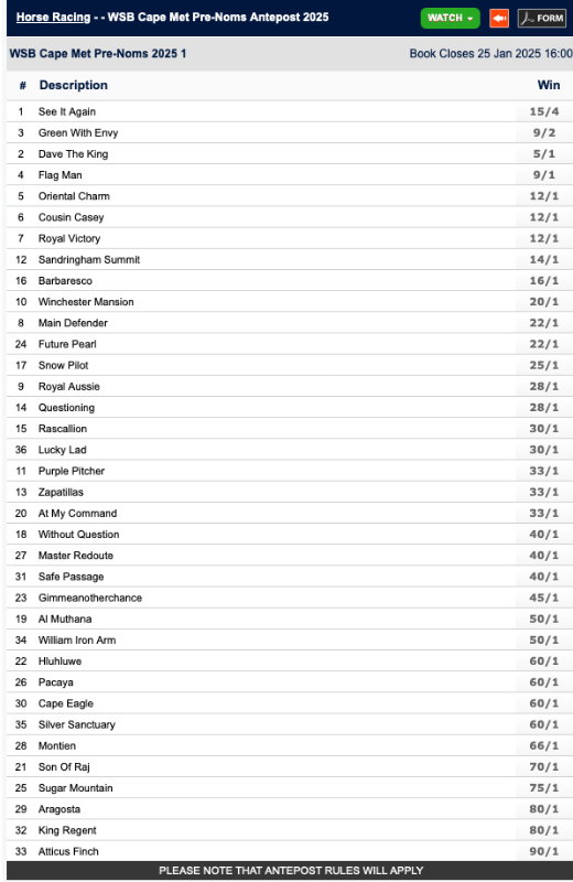 PRE NOMINATION: WORLD SPORTS BETTING CAPE TOWN MET ANTE POST BETTING