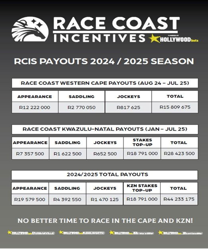 Stakeholders racing in the Cape and KZN can look forward to enhanced Race Coast incentives, powered by Hollywoodbets, in the new season, after over R25 million was paid to owners, trainers and jockeys last term.