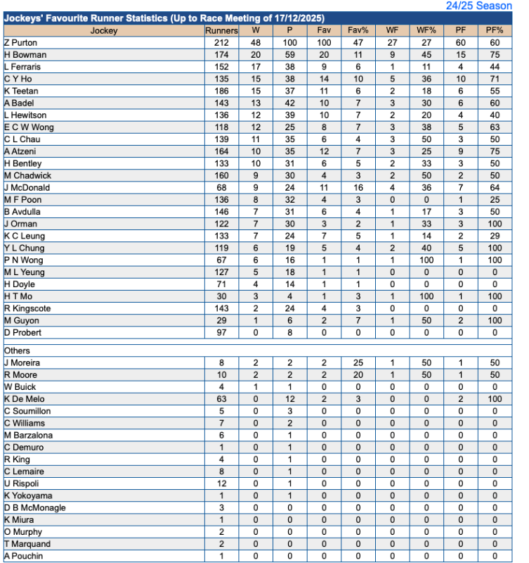 Another interesting thing I see there is that 13 jockeys have better winning percentage on favourites than Purton has.