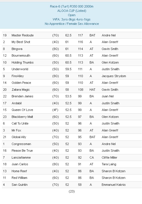 Re: Algoa Cup PE 31 October 2025 - Nominations 23