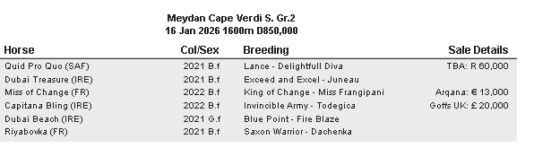 Quid Pro Quo out to Exchange South African Glory for DubaiDual South African Group 1 winner Quid Pro Quo is among the leading lights at Meydan’s bumper 10-race Dubai Racing Carnival meeting on Friday.The four-year-old filly makes her local debut in the G2 Cape Verdi [sponsored by Azizi Developments], race seven, over 1600metres on turf. Winner of the G1 Allan Robertson Championship and G1 Douglas Whyte Stakes for trainer Barend Botes, the four-year-old filly is now in the care of owners Team Valor and France-based trainer Jerome Reynier. She warmed up for this assignment by finishing tenth in the Listed Prix Miss Satamixa at Deauville on 13 December.“Quid Pro Quo has adapted very well to her new environment,” reported Reynier. “She’s moving really well on the dirt but we are looking forward to seeing her back on turf.