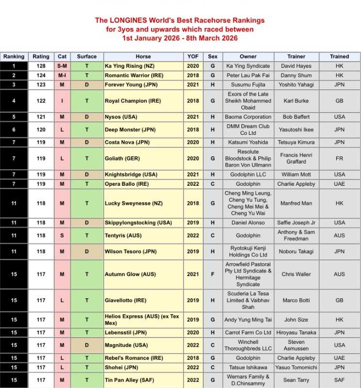 1 month 1 week agoStill you have to wonder - Ka Ying Rising 'only' 128 .... and Tin Pan Alley 117 ....Misleading as it's only the horses that have run from 1 Jan...so all the top European and British horses not even out yet ..Â
