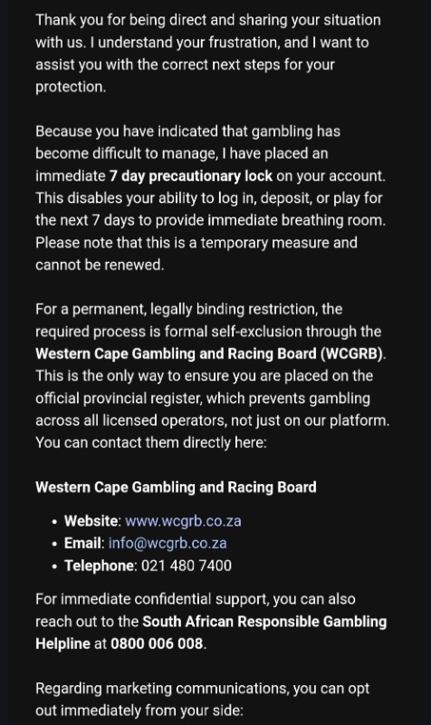 It's easy to open an account but when you try protect yourself, you are told that you need to jump through a few more hoops and get confirmation from the Western Cape Gambling Board before they allow it?