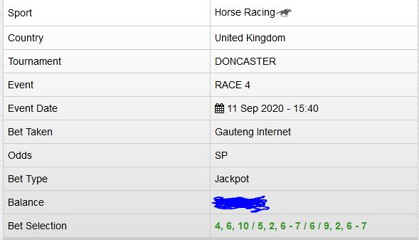 3 Horse Racing United Kingdom THIRSK RACE 6 2020-09-14 16:45 4. LADY G M/Win 0.04 Pending