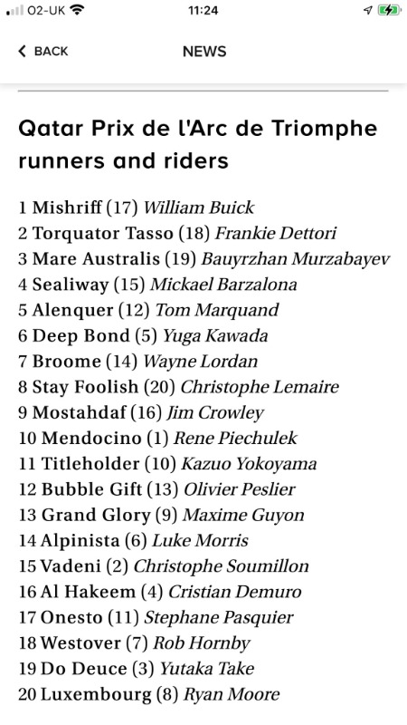 Was never liking Luxembourg but managed to get 16s. I really want a Japanese horse to win the Arc but there are 4 of them. Maybe Titleholder.