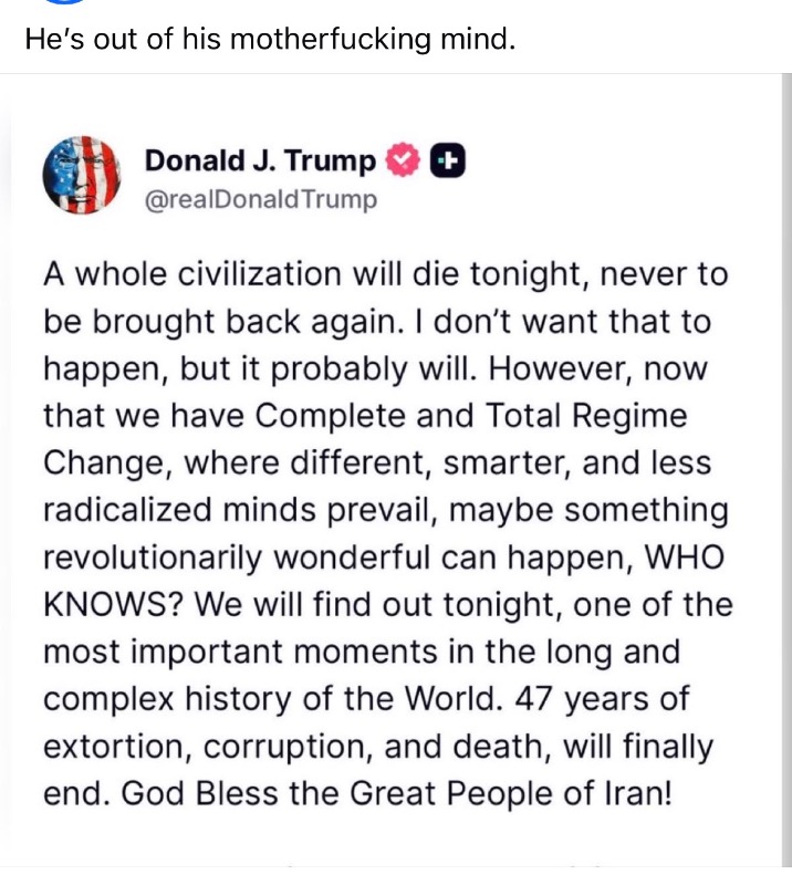 Trump's actions now are that of a mental, desperate person. He is totally farked. Either full on land invasion, in which the whole world goes into depression and the war goes on forever, or he declares victory (in his head) and walks away, cap in hand and tail up his rectum.